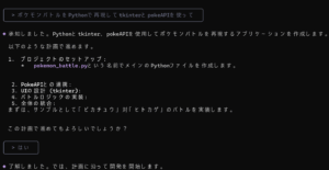 「Pythonでポケモンバトルを再現して」「TkinterとPokeAPIを使って」──こんな感じで自然な文章でAIに指示するだけで、ベースのコードがサクッと生成されました。